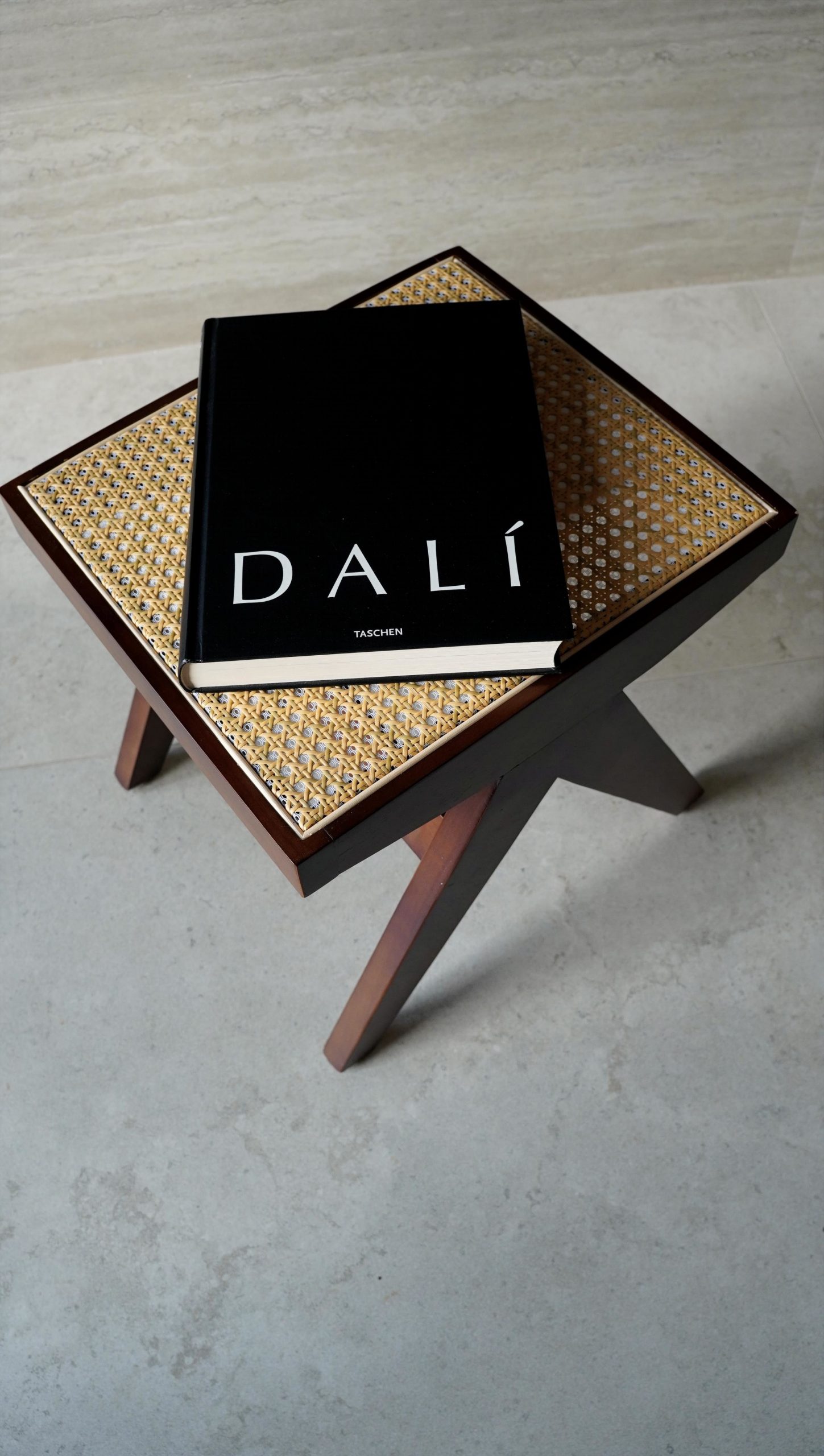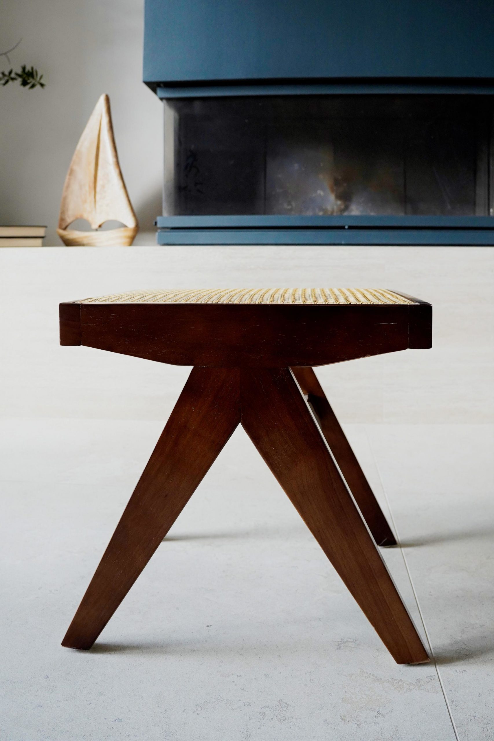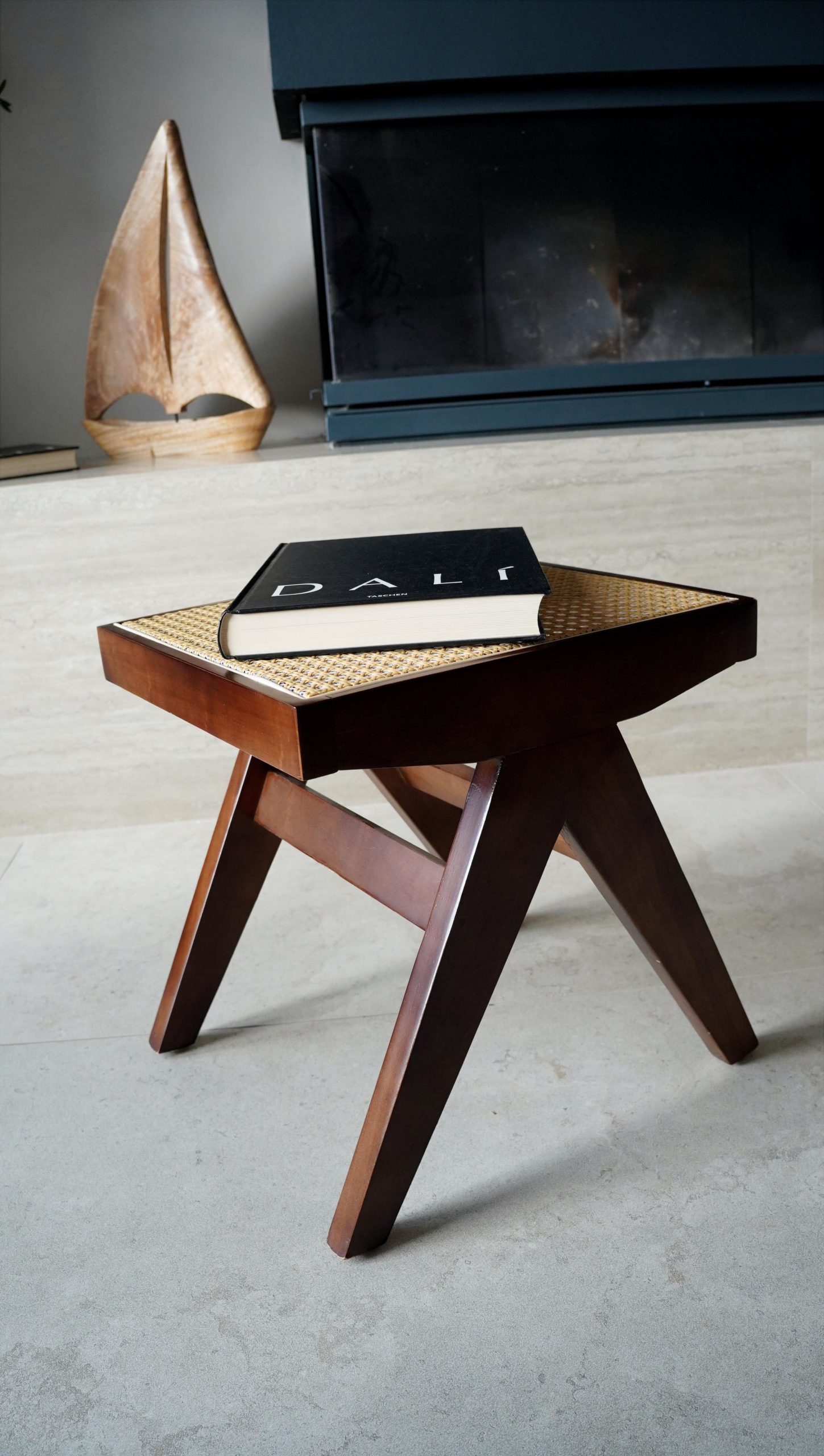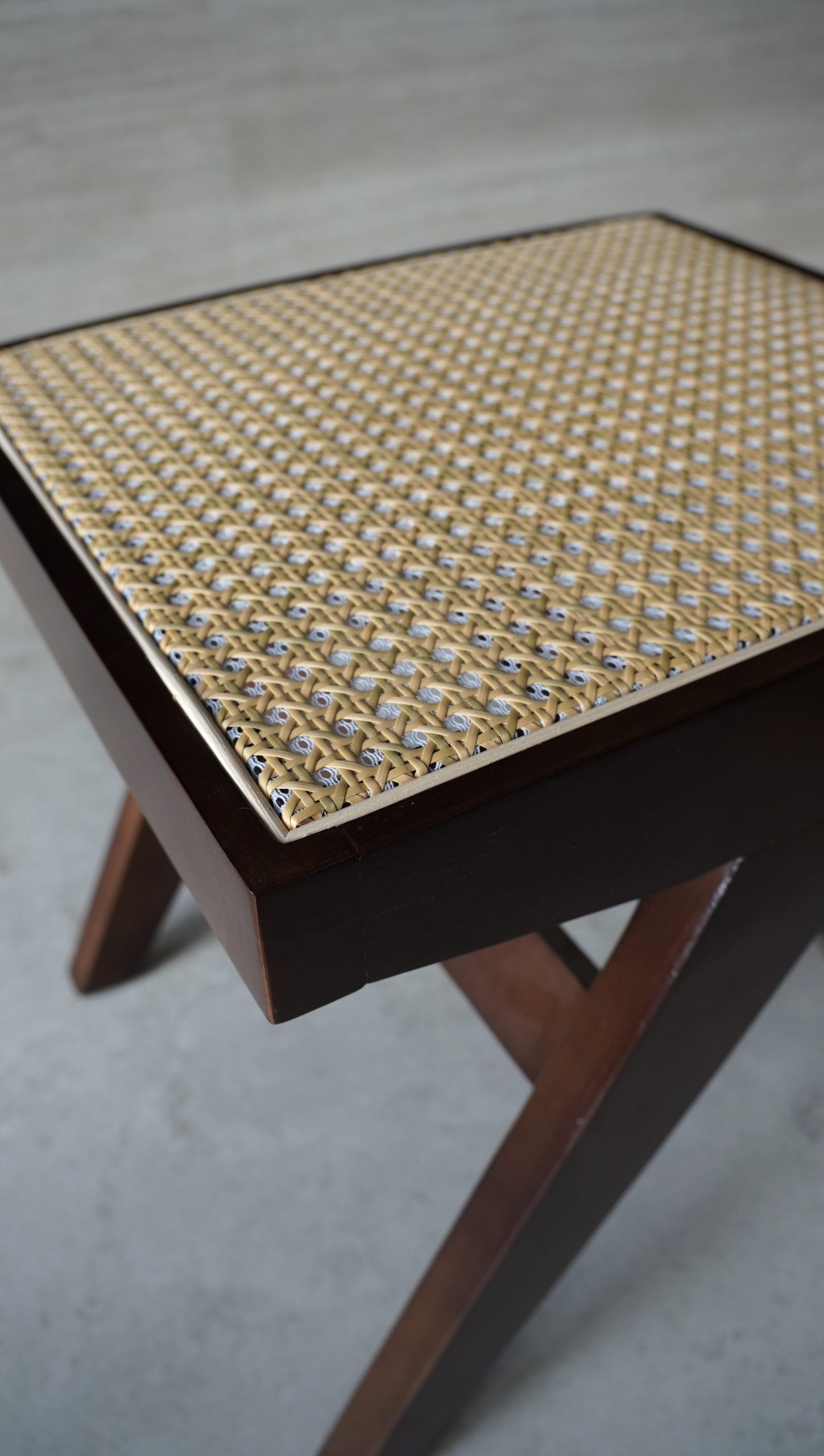 Taburete en madera maciza de teca blanca y rejilla de ratán