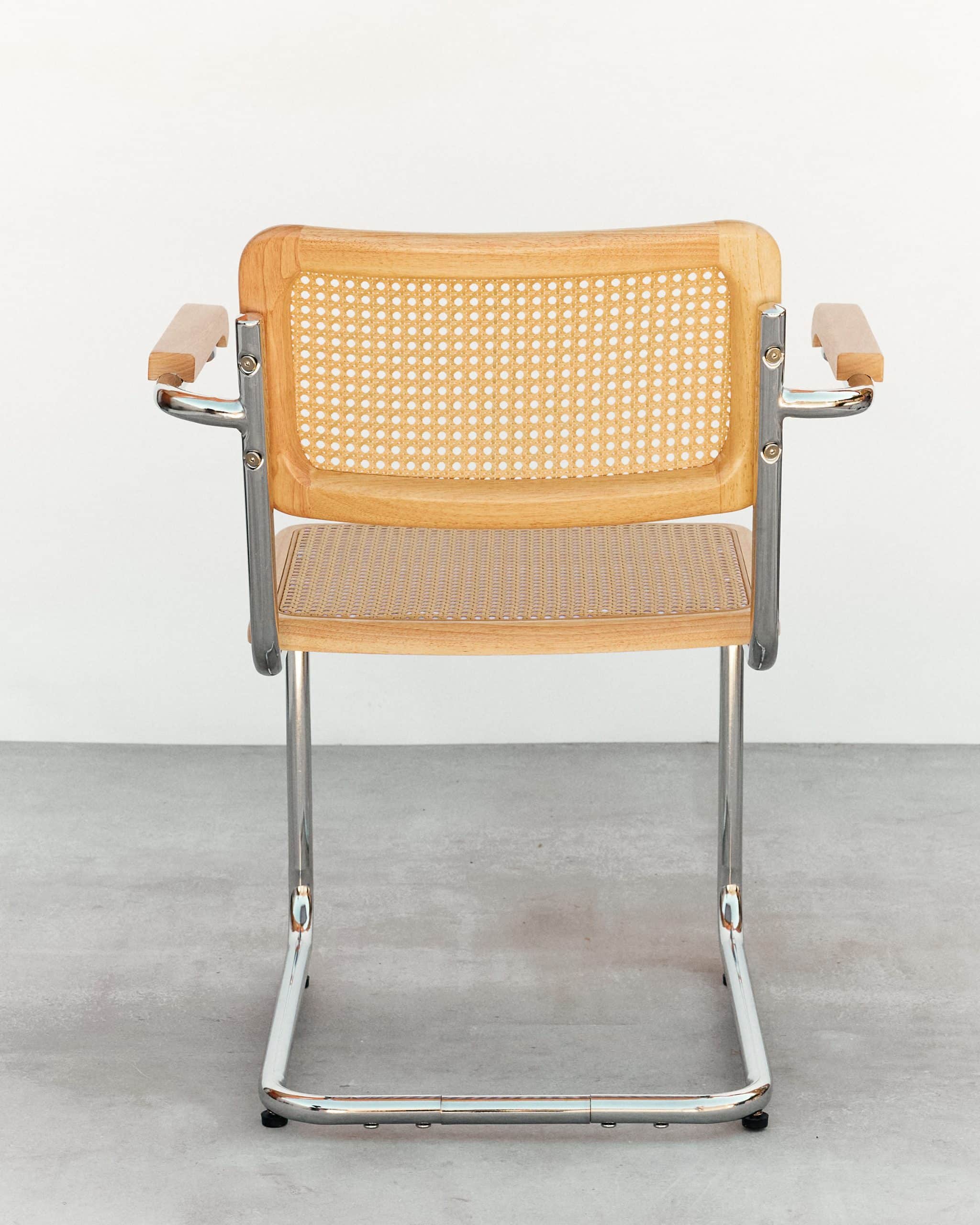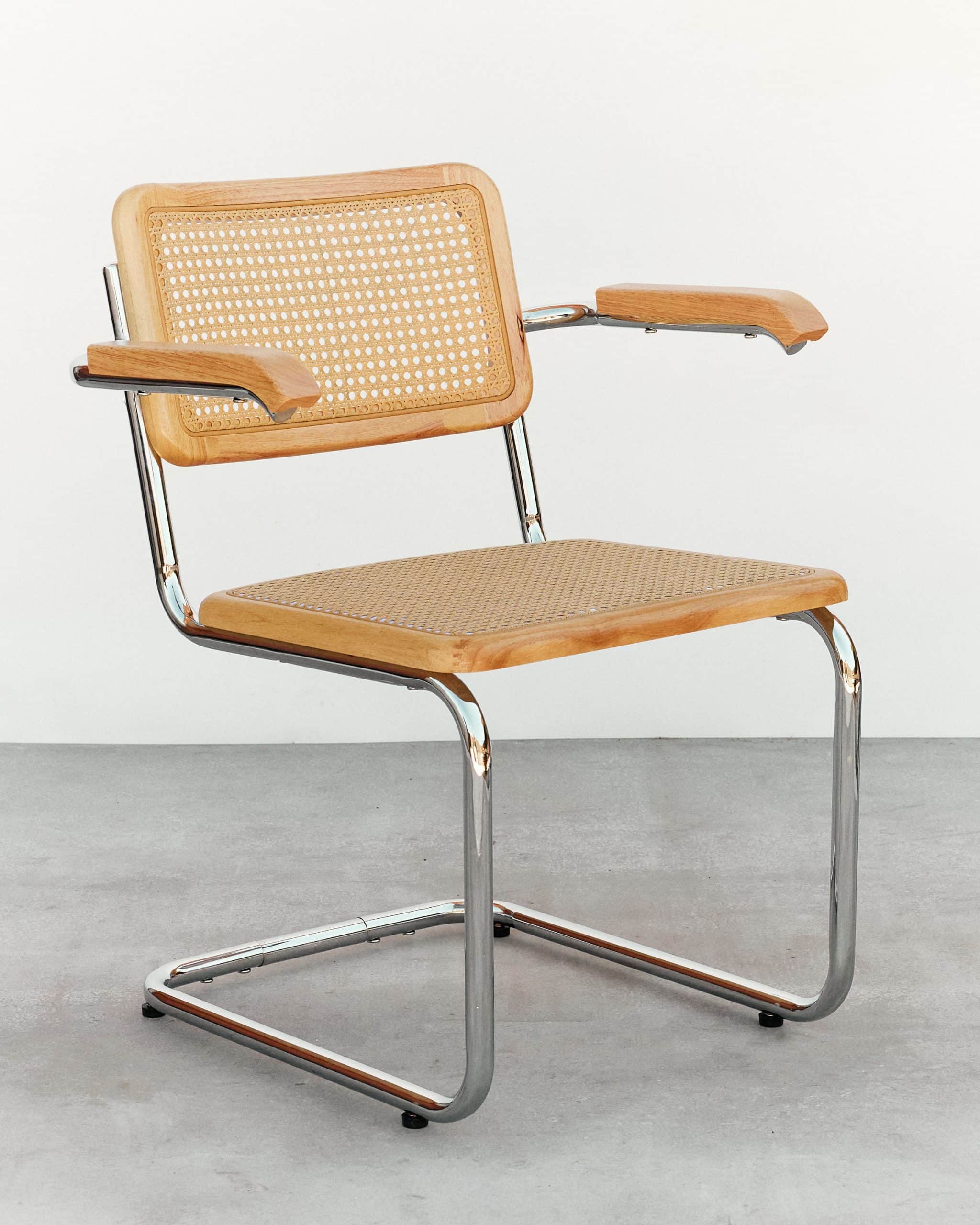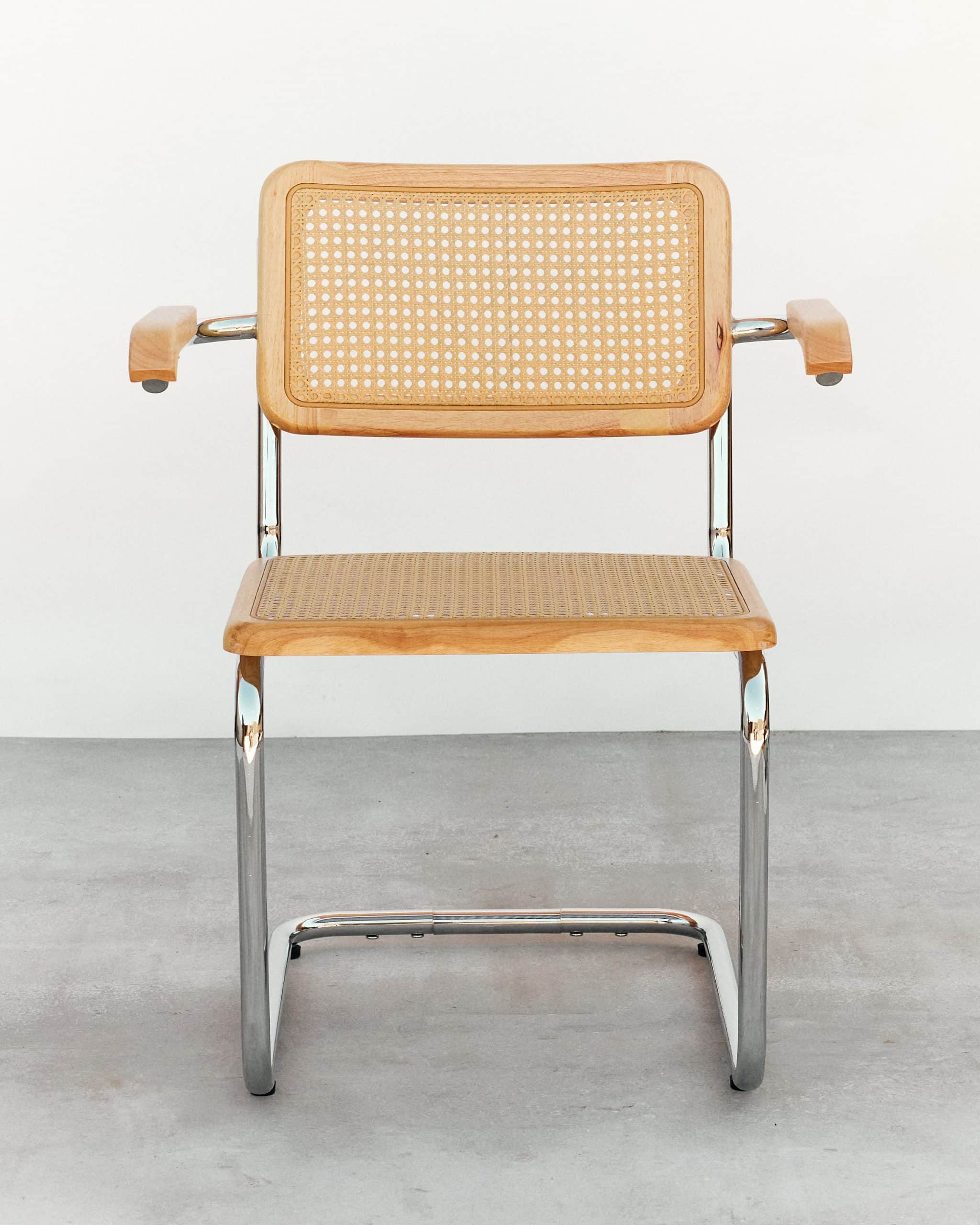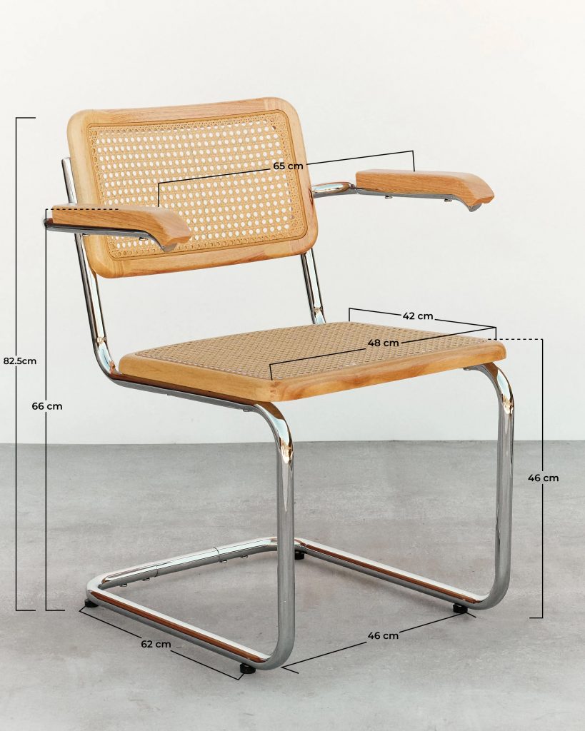 Variante con brazos del icónico diseño cesca, manteniendo los elementos fundamentals de este diseño, creado por Marcel Breuer en 1928, un icono del diseño industrial conocido por su estructura de acero tubular, su asiento y respaldo en rejilla de ratan que fue en su tiempo un punto y aparte en un mundo con sillas de 4 patas.