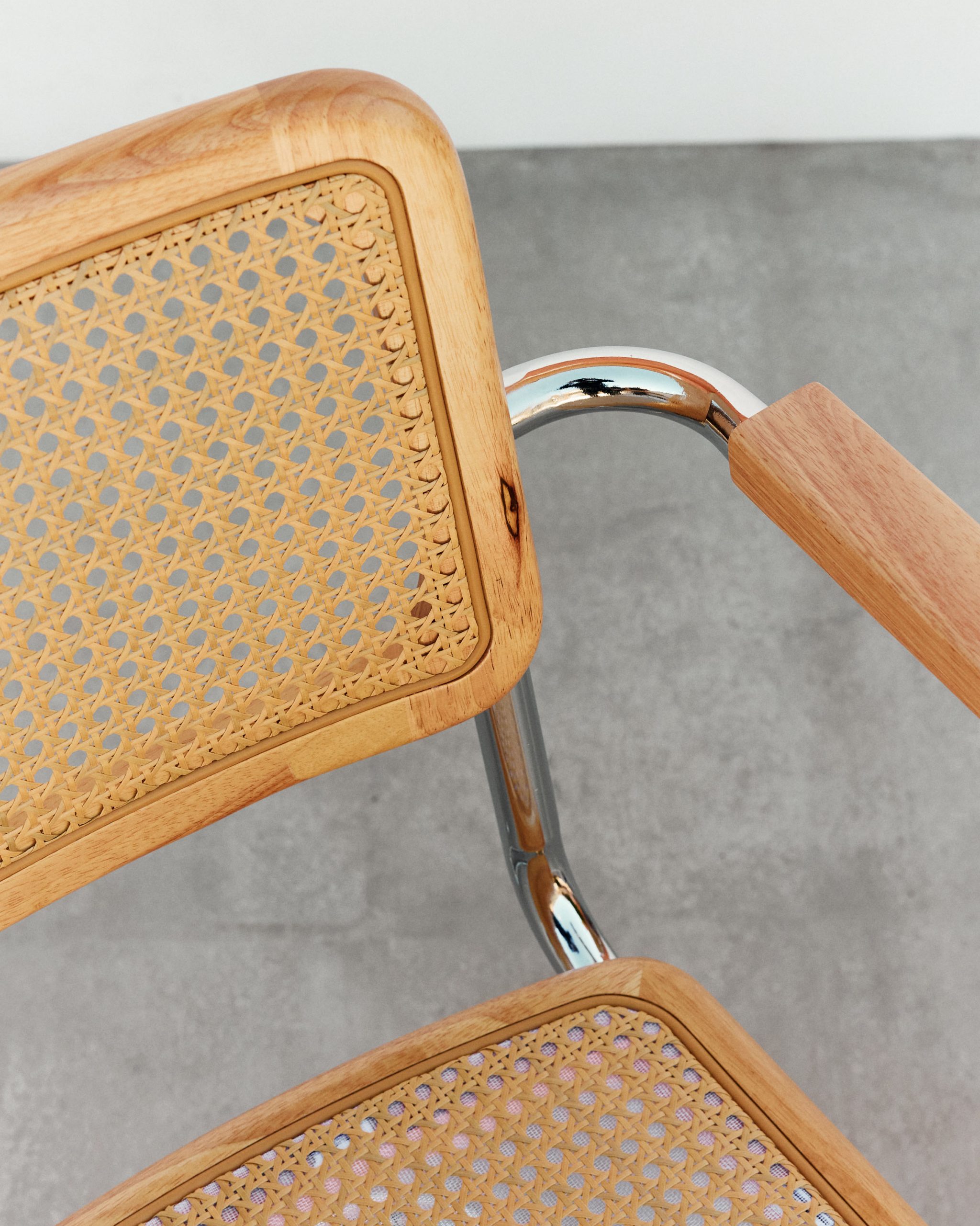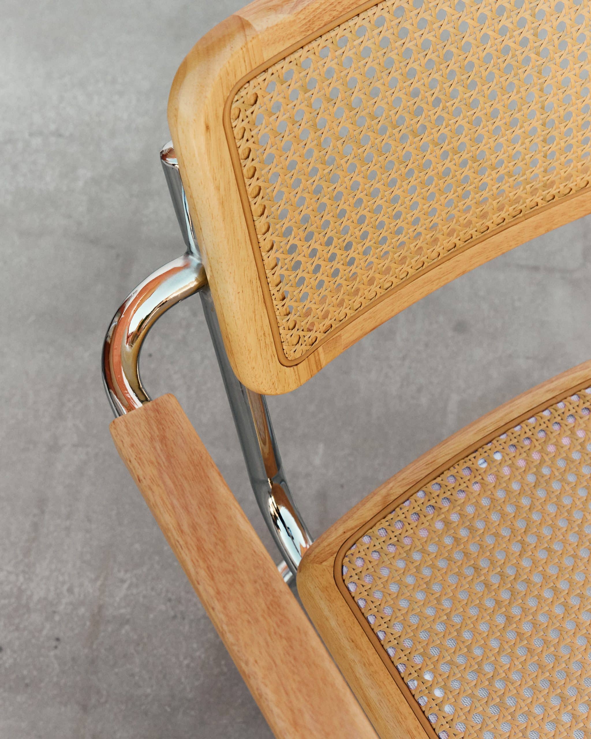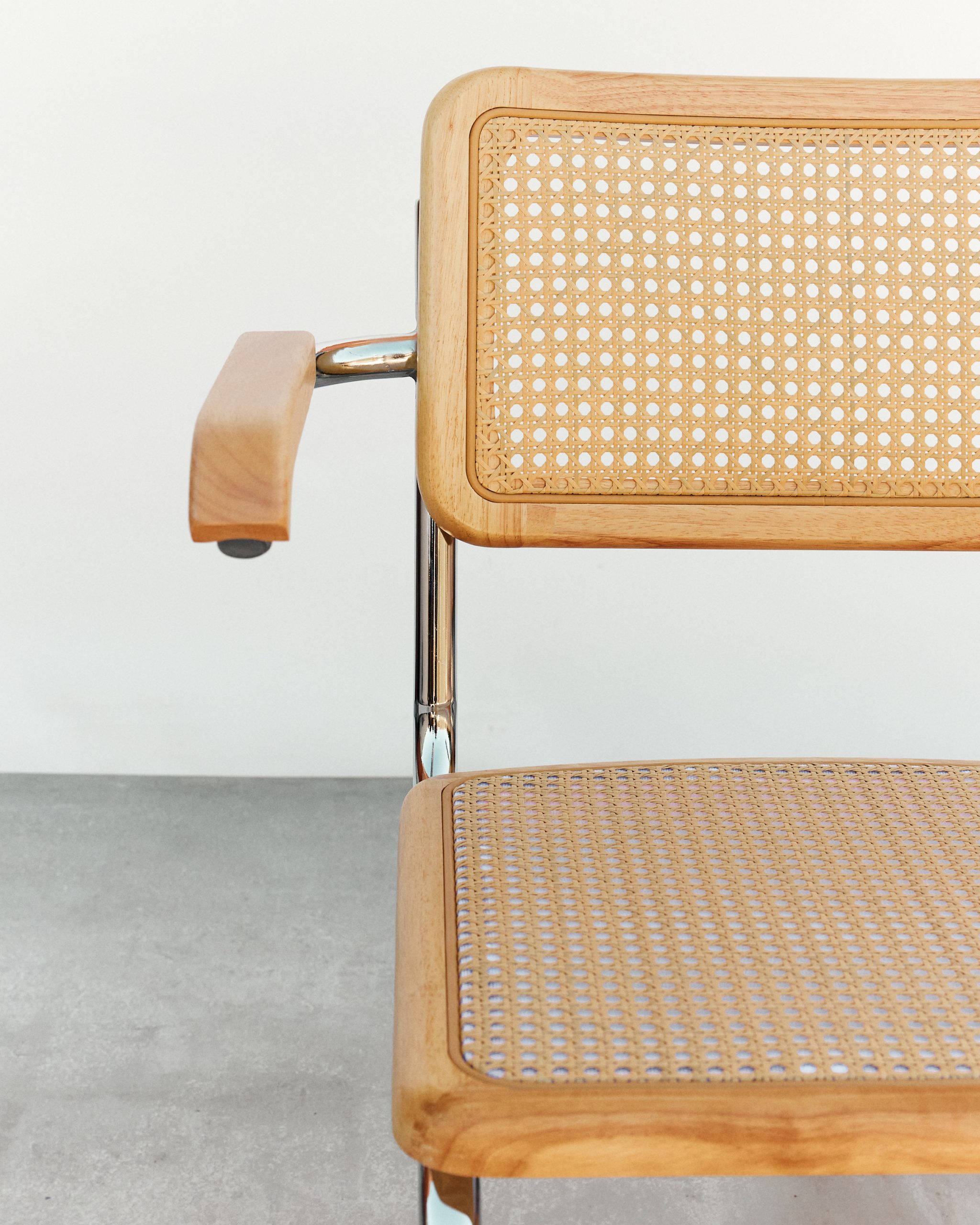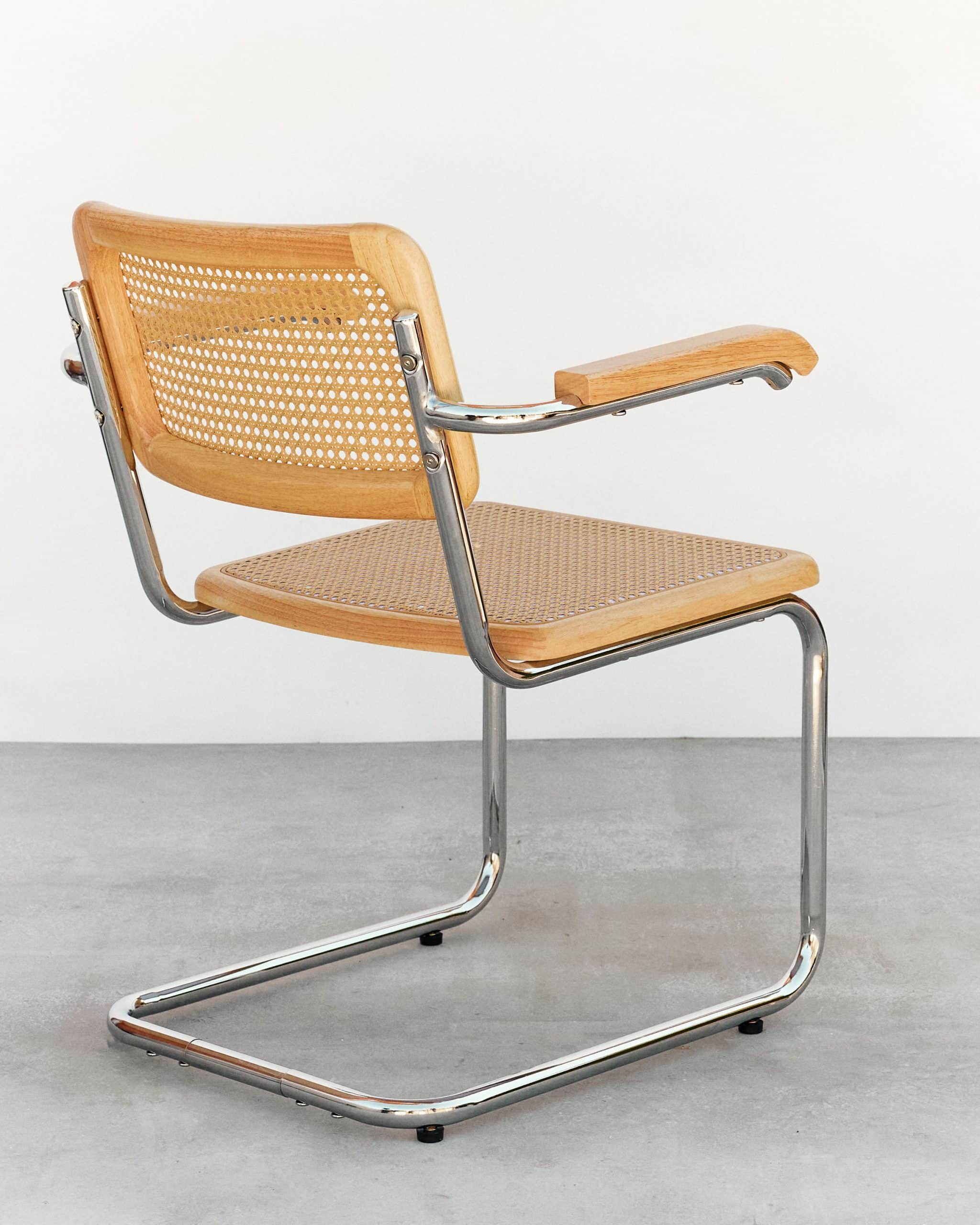 Variante con brazos del icónico diseño cesca, manteniendo los elementos fundamentals de este diseño, creado por Marcel Breuer en 1928, un icono del diseño industrial conocido por su estructura de acero tubular, su asiento y respaldo en rejilla de ratan que fue en su tiempo un punto y aparte en un mundo con sillas de 4 patas.