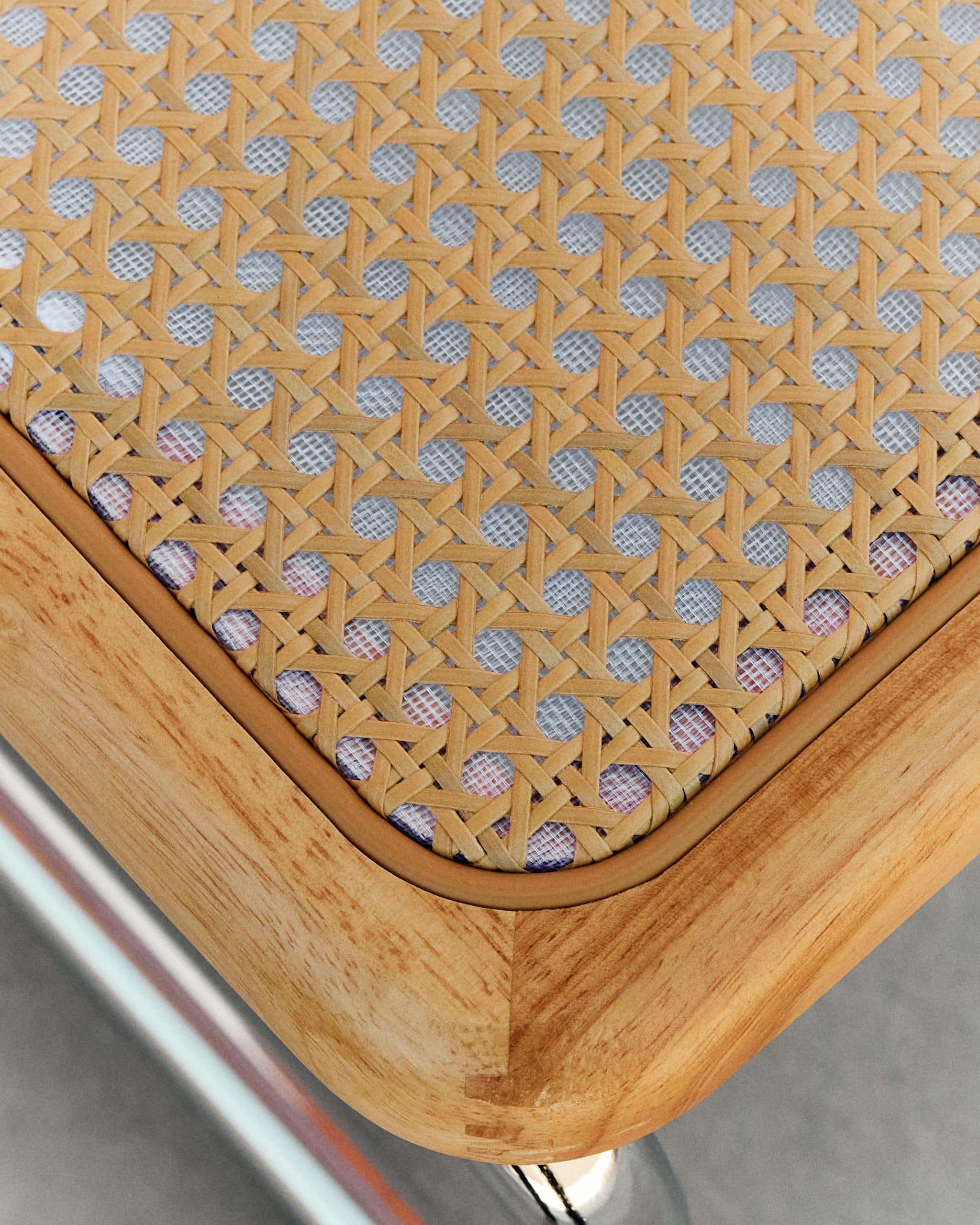 Amalia, destaca por su elegante combinación de materiales y su diseño atemporal. Su estructura en tubo de acero cromado, curvada con líneas limpias y fluidas, crea un efecto cantilever que aporta ligereza visual y un sutil movimiento al sentarse. Asiento y respaldo elaborados en rejilla de ratan enmarcados por una estructura en madera maciza de haya aportando calidez y textura convirtiéndola en una pieza ideal para usar en comedores, despachos o espacios de diseño contemporáneo.