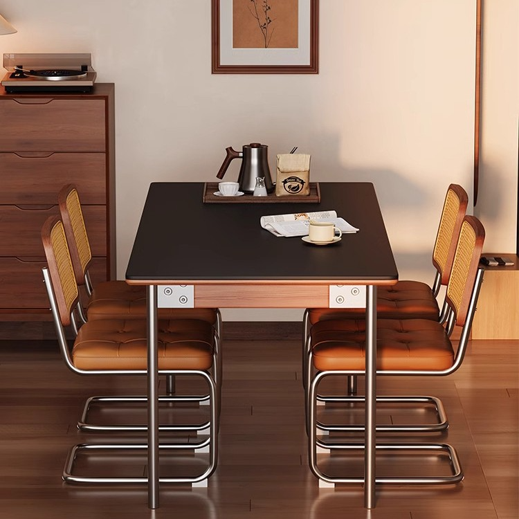 Mesa de comedor en madera maciza de abedul, piedra natural sinterizada y estructura en acero pulido inox