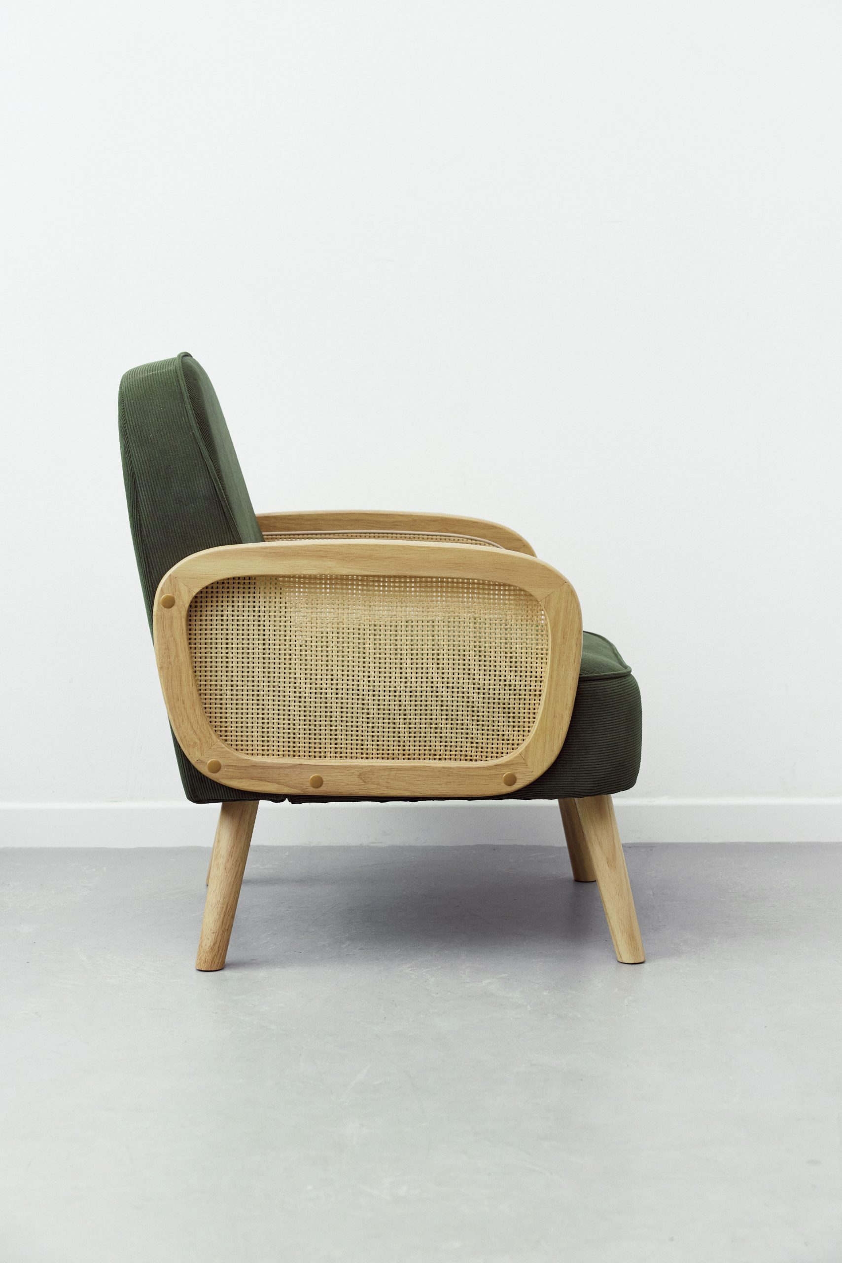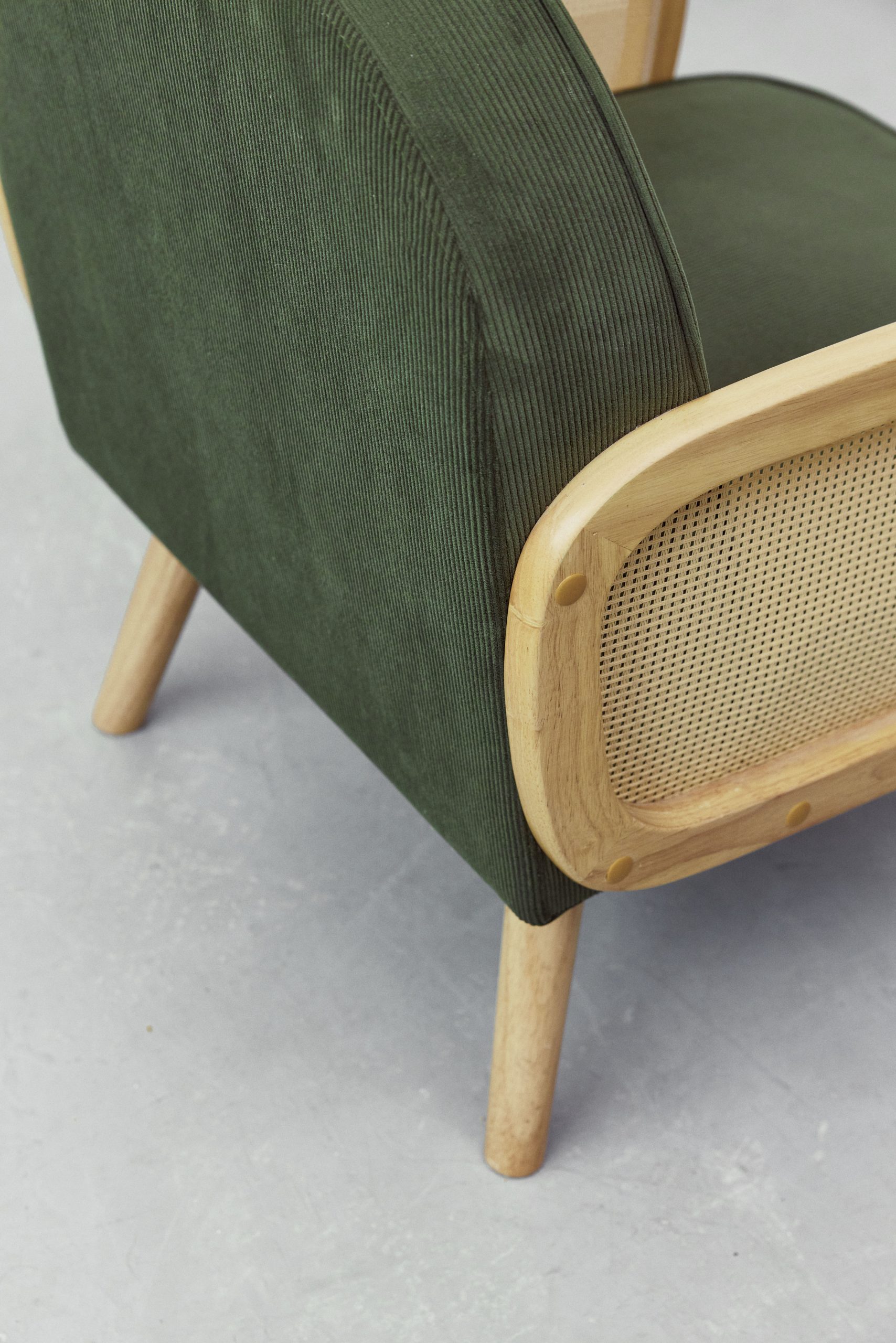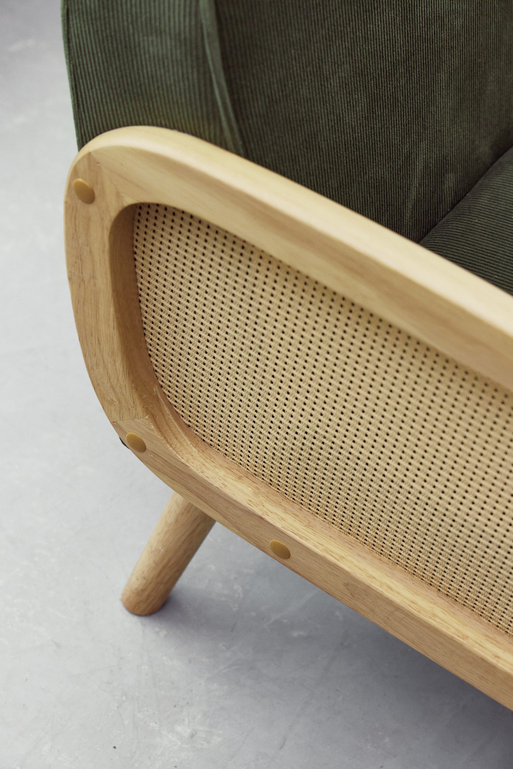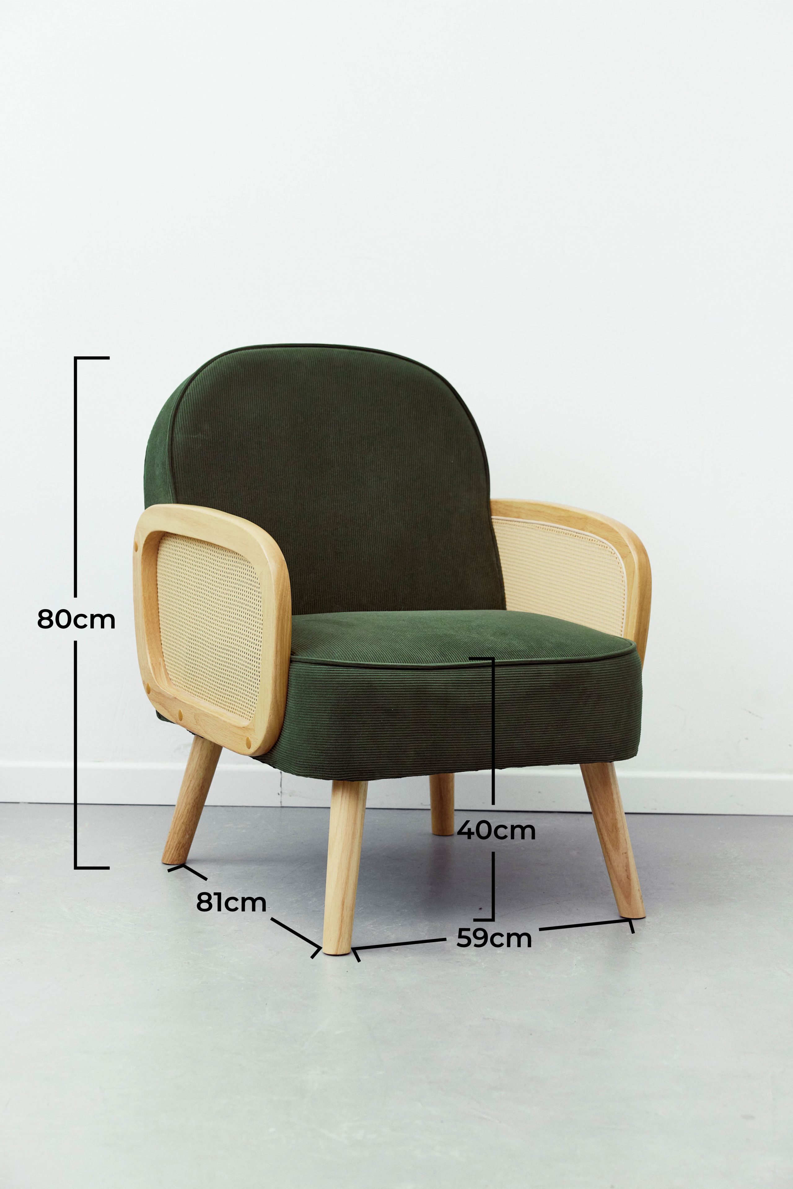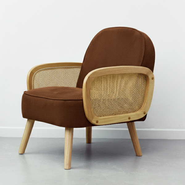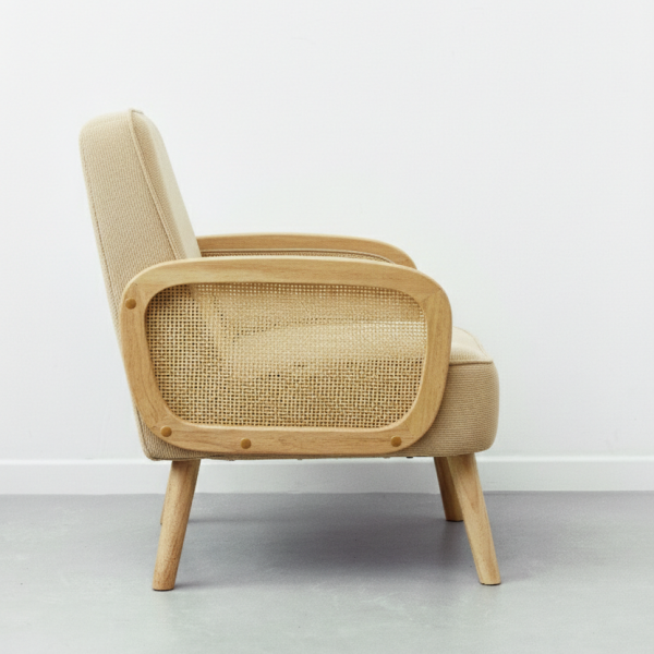Sillon tejido en micropana suave, madera maciza de teca y rejilla de mimbre