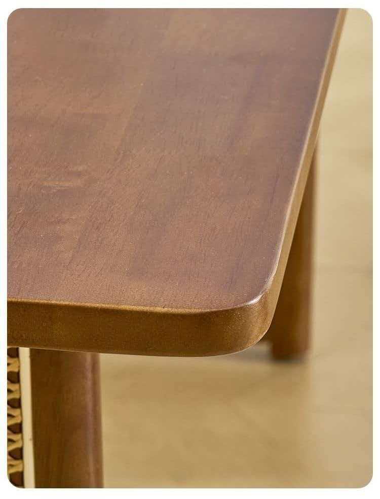 Teca maciza en toda la estructura, incluyendo tablero y patas, lo que garantiza una pieza robusta y de larga vida útil. Rejilla de ratán en los laterales de la base, que añade textura y un contraste cálido sin comprometer la estabilidad.